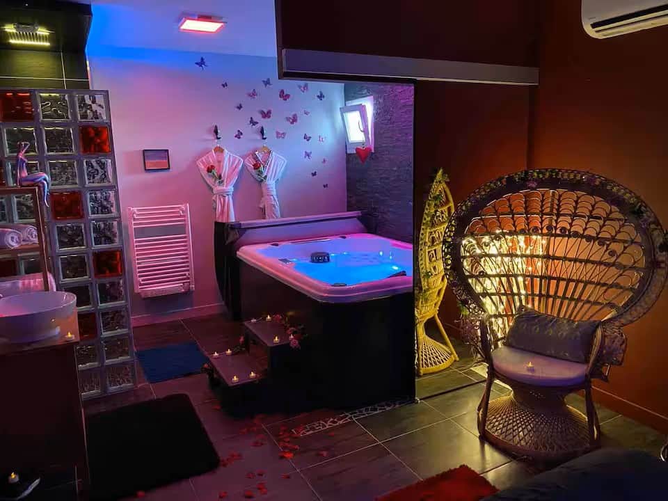 Ambiance romantique avec jacuzzi privé, grand lit, lumières tamisées et équipements premium.